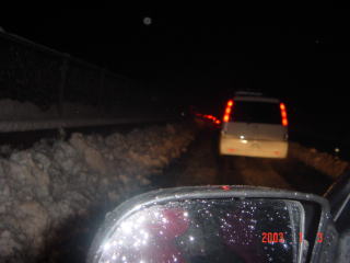 大雪のため前方でバスが立ち往生してゲレンデ手前10キロで引き返した