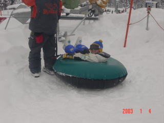 ここのスキー場はチュービングと言ってタイヤに乗って雪の上を