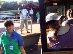 | 【日程】 3月3日 ホテル出発8時ホテル近くにある3国国境地点へ行く。ブラジル側国境地点はイグアス川対岸にあり、パラグアイ国境地点はパラナ川対岸にあった。9時のトロッコ列車でイグアスノ滝観光に出かけた。途中駅で乗り換え終点まで行き下車。駅前に歩行桟橋があり約1.2Kmの遊歩道を歩くと、悪魔の喉笛に到着する。昨日観たブラジル側より川に近く水しぶきでカメラがすぐに濡れてしまう。約30分滞在し元の駅に戻る。トロッコ列車に一駅乗り、更にイグアスノ滝観光に出かける。約400の滝があるので飽きることがない。途中でアライグマ家族に遭遇し、エサをやる人を見かけたが、野生動物のためこのような行為は避けたいものだ。昼食後ボートツアーに出かけた。ずぶぬれになる覚悟で服装も準備していたためしっかりと楽しむことがきた。 |