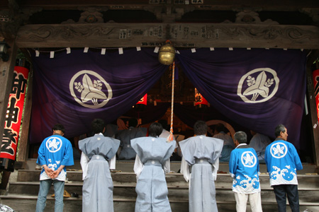 (山車に乗った獅子が神様の先払いをして人々に注意を促す)