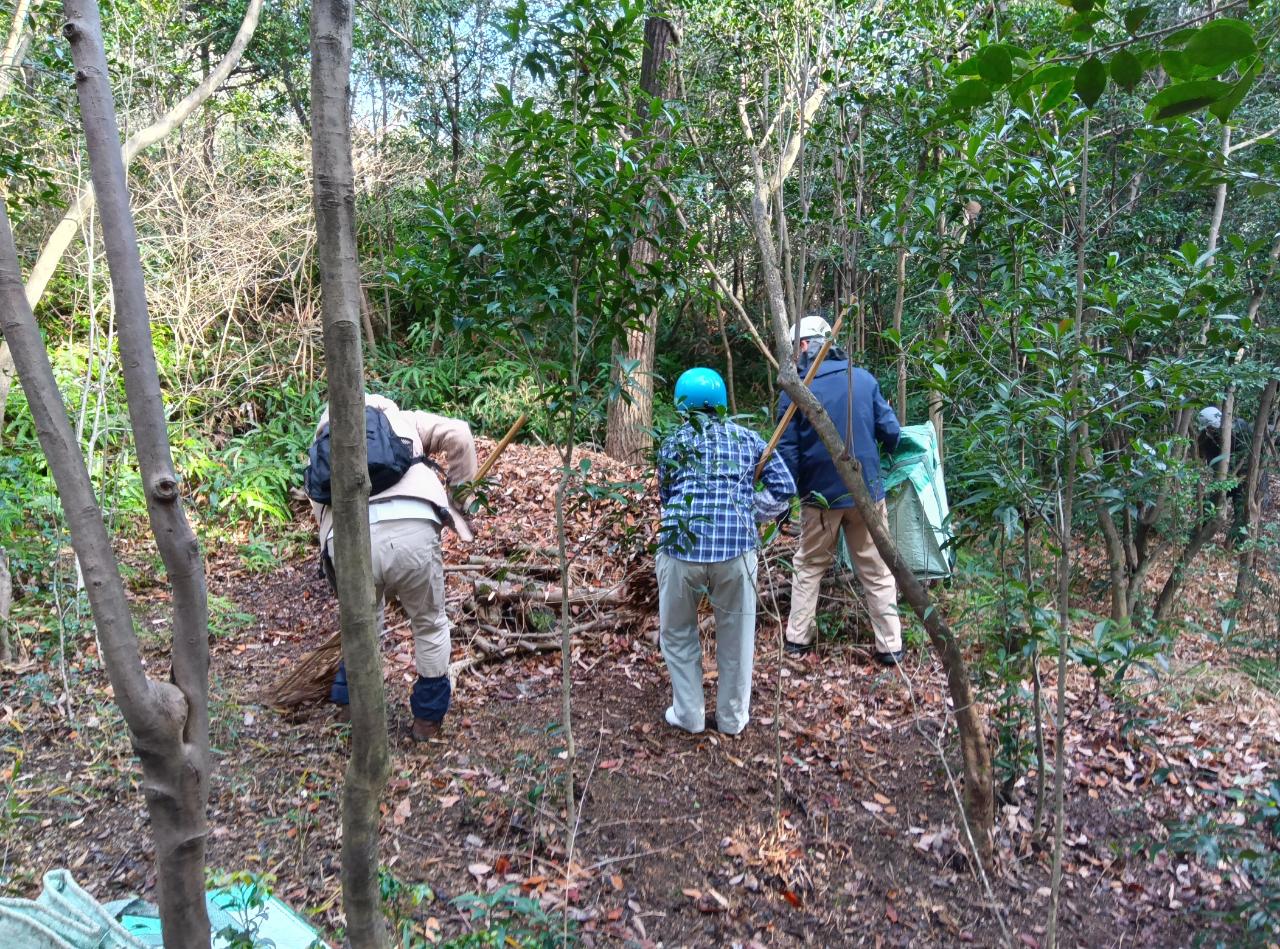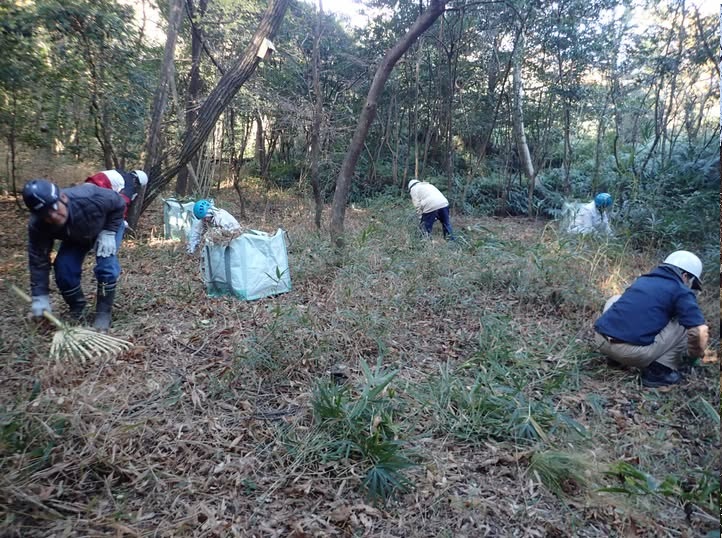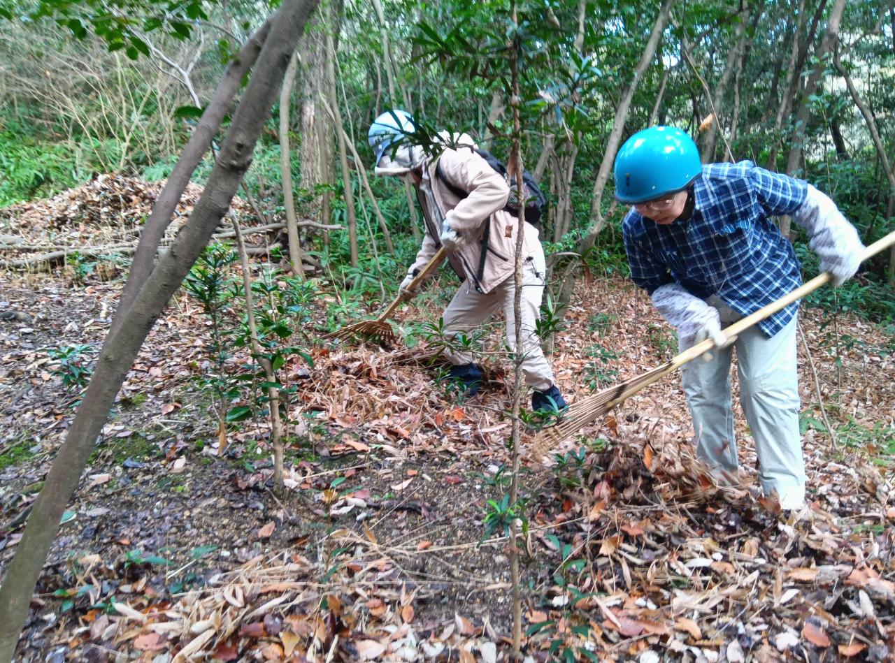 雑木林の地面に落葉が厚く堆積するとスミレなどの草花が育てなくなってしまうため、会ではこの時期から二村山の落葉かきを行っています。
