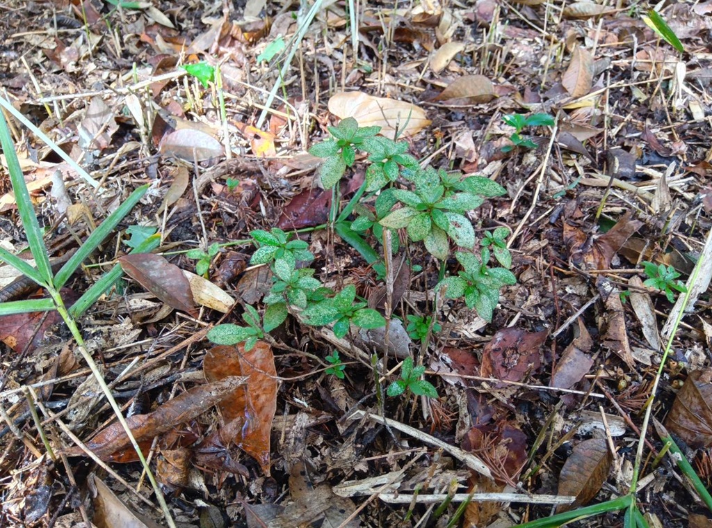 ササに埋もれたツツジの幼木の葉は元気ない様子。いっぱい日光をあびて大きくなってね。