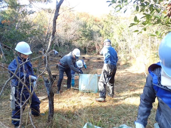 湧水湿地に栄養分がたまらないように毎年冬に草を刈って持ち出します。安全のため機械での草刈と片づけは別の日に行います。