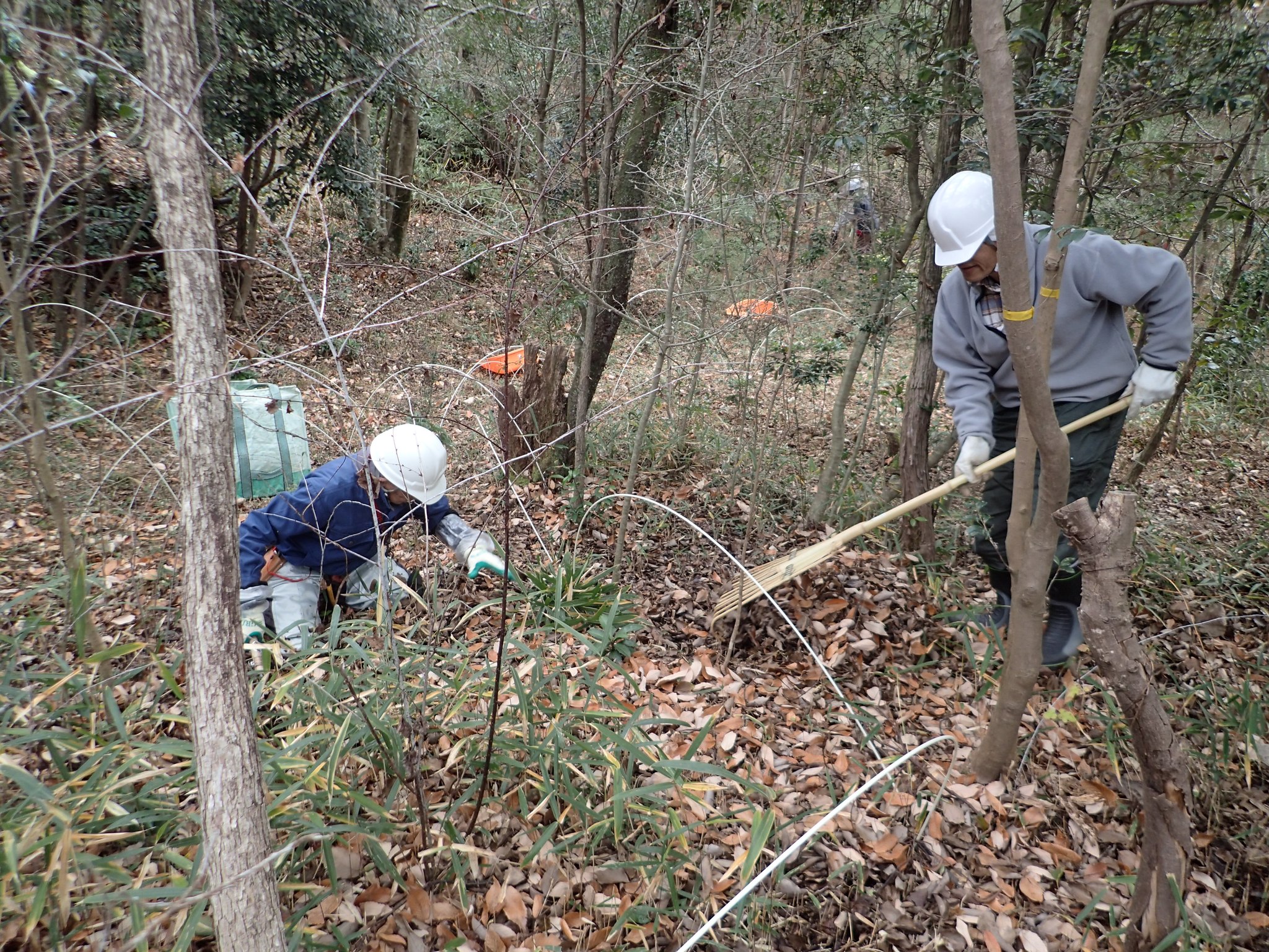 今回の作業場所はこの準備作業を秋に行っていないため、まずは草刈から始めそれが終わってから落葉をかきました。