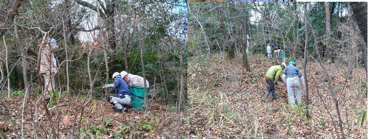 前回11月3日に続きササやシダの草刈をしました。目的は二つ。雑木林を明るくするとササやシダが繁茂してツツジやスミレの